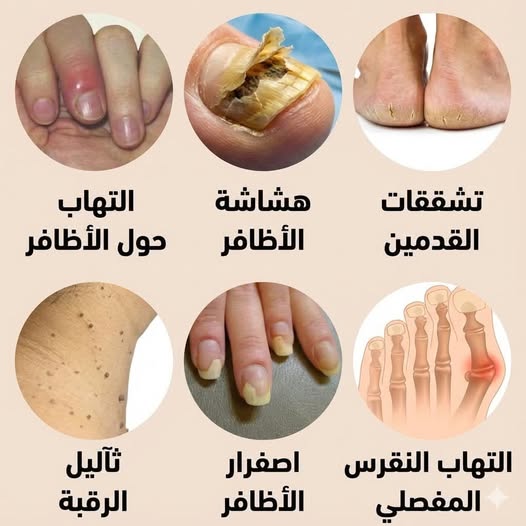 **مقدمة:** صحة جلدنا وأظافرنا ومفاصلنا هي مرآة تعكس صحتنا العامة. في كثير من الأحيان، نتجاهل بعض العلامات والأعراض التي قد تبدو بسيطة، ولكنها قد تكون مؤشرًا على مشاكل صحية تحتاج إلى اهتمام. الصورة التي بين أيدينا تسلط الضوء على ست حالات طبية شىائعة تواجه الكثير من الناس: التهاب حول الأظافر، هشاشة الأظافر، تشققات القدمين، ثآليل الرقبة، اصفرار الأظافر، والتهاب النقرس المفصلي. في هذا المقال، سنستعرض أسباب كل حالة وطرق علاجها والوقاية منها.
