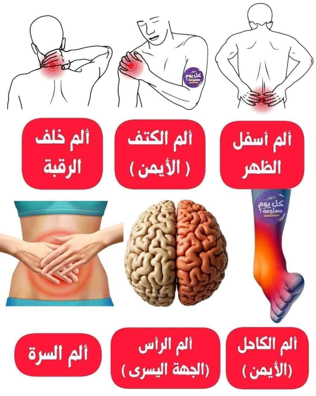 يُعد الألم وسيلة الجسم الطبيعية لإرسال إشارات تحذيرية بوجود خلل أو إجهاد أو مشكلة صحية محتملة. يختلف مكان الألم وحدته ومدته، وقد يكون بسيطًا ومؤقتًا، أو مؤشرًا يستدعي الانتباه. في هذا المقال نستعرض أشهر أماكن آلام الجسم الشائعة مثل ألم خلف الرقبة، الكتف، أسفل الظهر، السرة، الرأس، والكاحل، مع توضيح الأسباب المحتملة والنصائح العامة للتعامل معها.